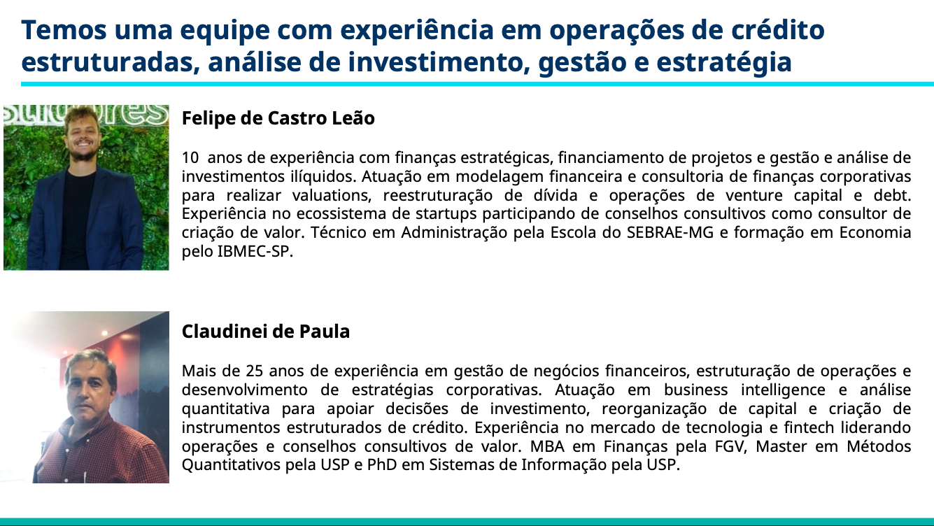 A Unita Capital se destaca por combinar experiência executiva, visão estratégica e forte conhecimento técnico em operações financeiras, incluindo: